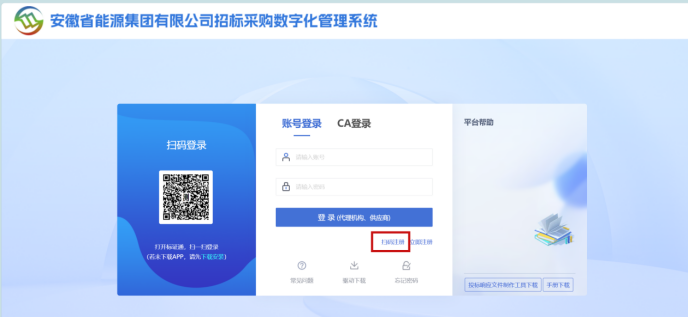 1、供应商登录交易平台,点击“扫码注册”。如下图: