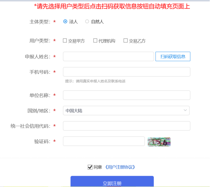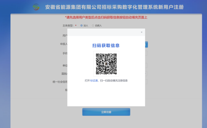 3、填写注册信息,点击【扫码获取信息】通过标证通扫码来获取证书单位信息,如单位名称、申报人名称等。如下图: