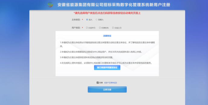 3、点击“我已阅读并同意该协议”按钮,确认注册协议。如下图: